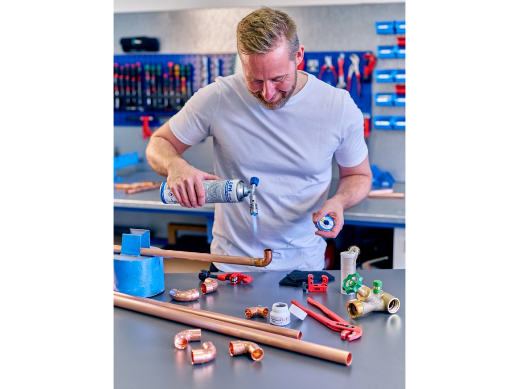 Tvrdé pájení měděných trubek až do Ø 22 mm, měkké pájení až do Ø 28 mm.